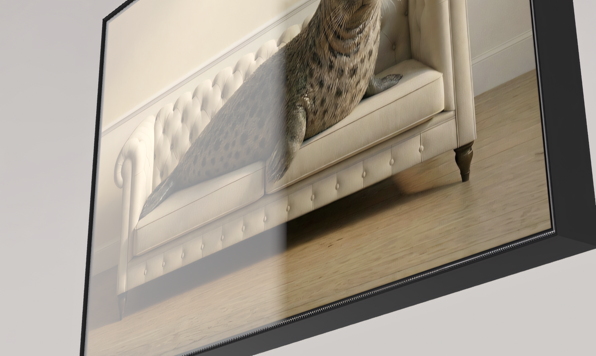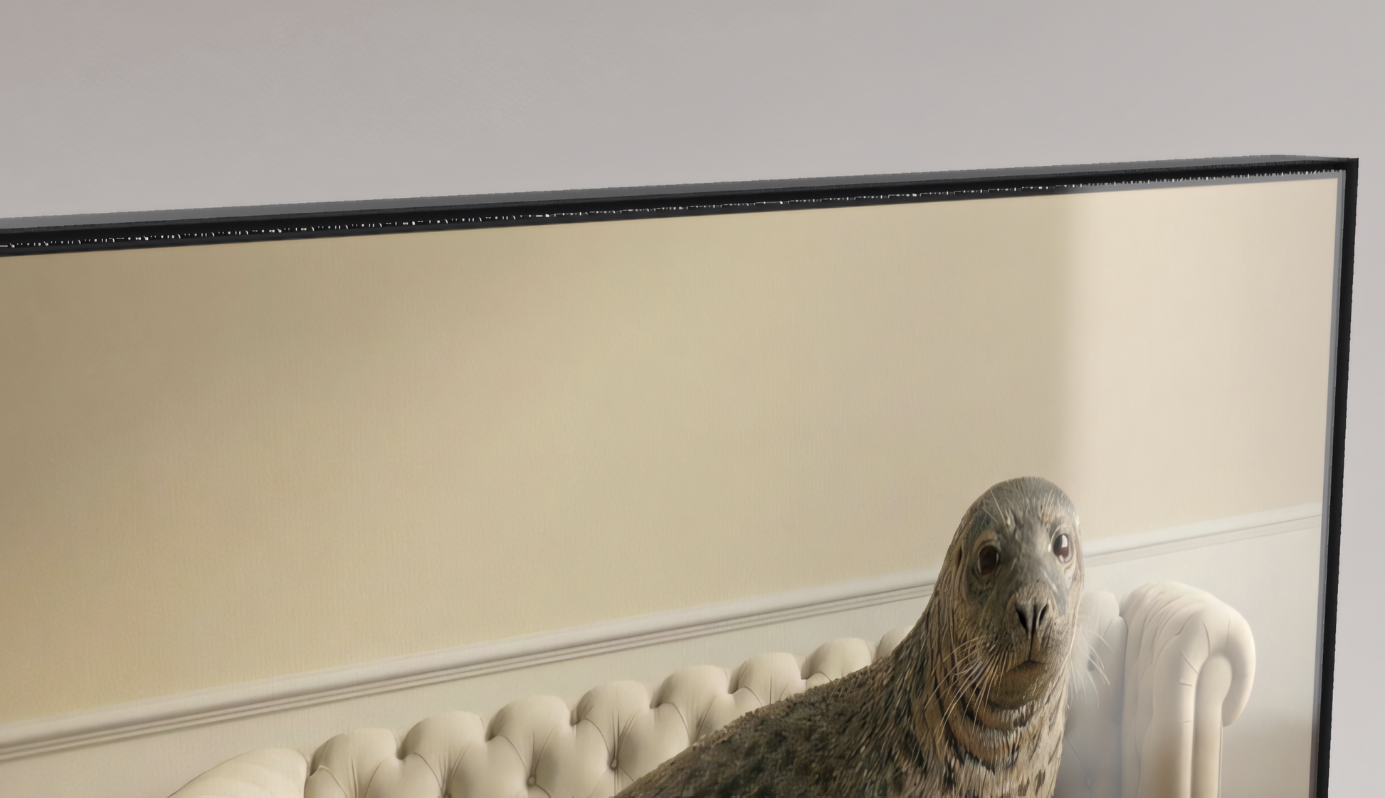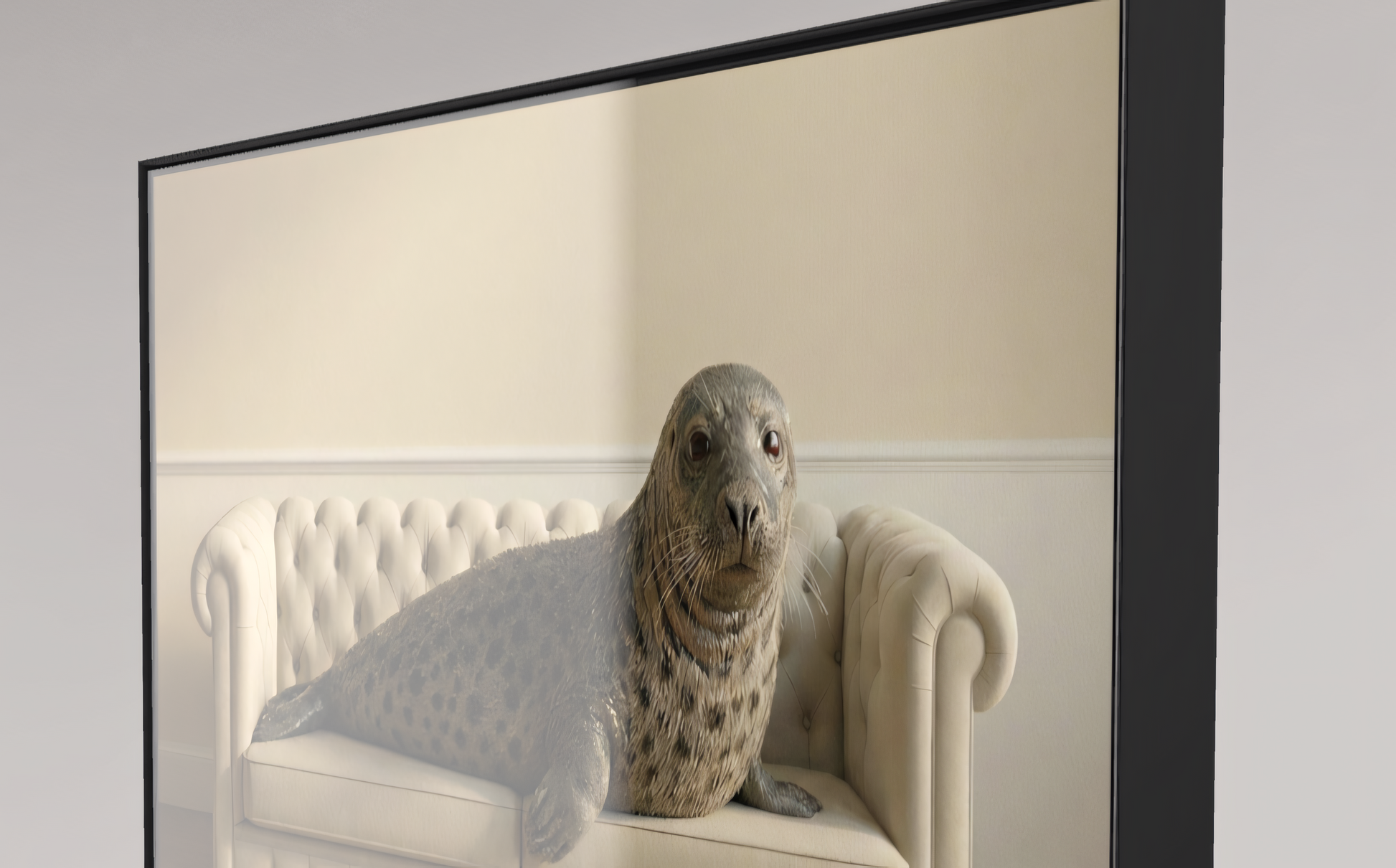 A grey seal rests on pale sand, half in shade, half in the afterglow of the North Sea sun. Its body seems heavy, yet its gaze holds gentleness – a quiet awareness of the sea that sustains it. Fine grains of sand cling to its fur, which shimmers in shades of gray and silver, as if the water itself had painted it.