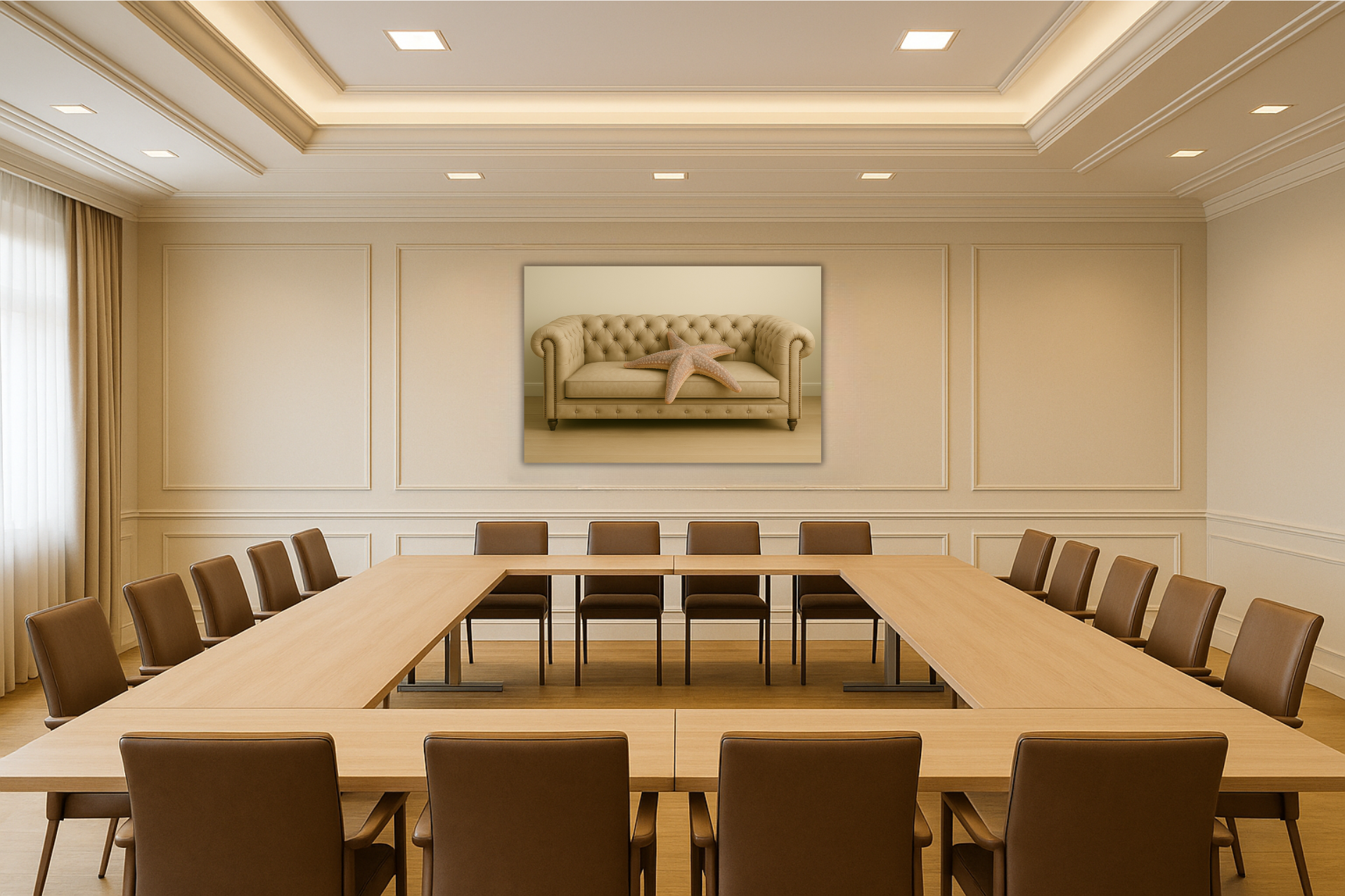 Ein Seestern liegt auf hellem Sandboden, umgeben von schimmernden Lichtreflexen des Flachwassers. Einer seiner Arme hat sich gerade gelöst – ein leiser Akt der Selbstrettung. Kein Blut, kein Drama, nur eine subtile Muskelspannung an der Bruchstelle, wo feine Partikel aufwirbeln. Das Meer bleibt still, als hielte es den Atem an.