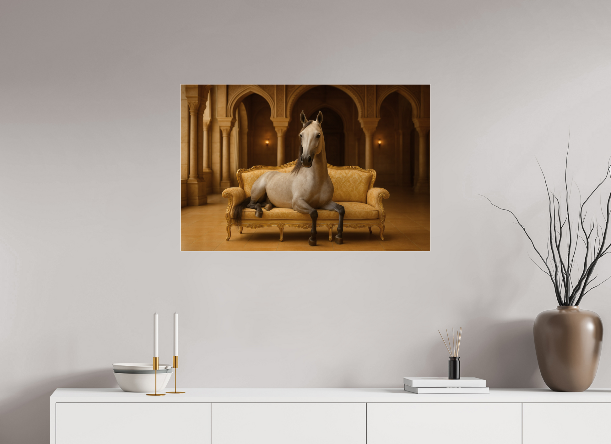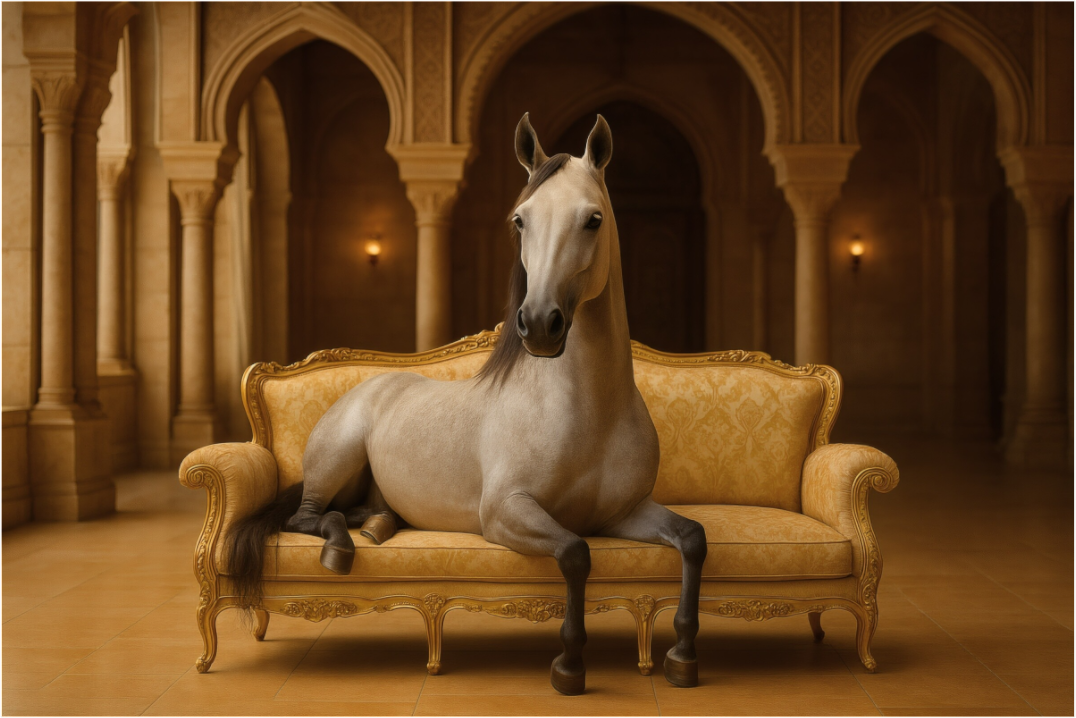 The Arabian thoroughbred stallion sits on a golden sofa in an arcaded hall. His proud posture and noble aura embody royal dignity.