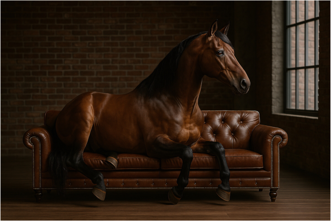 The Mustang in the loft: its powerful body on a dark leather sofa, surrounded by modern industrial charm. An encounter between wilderness and contemporary design.
