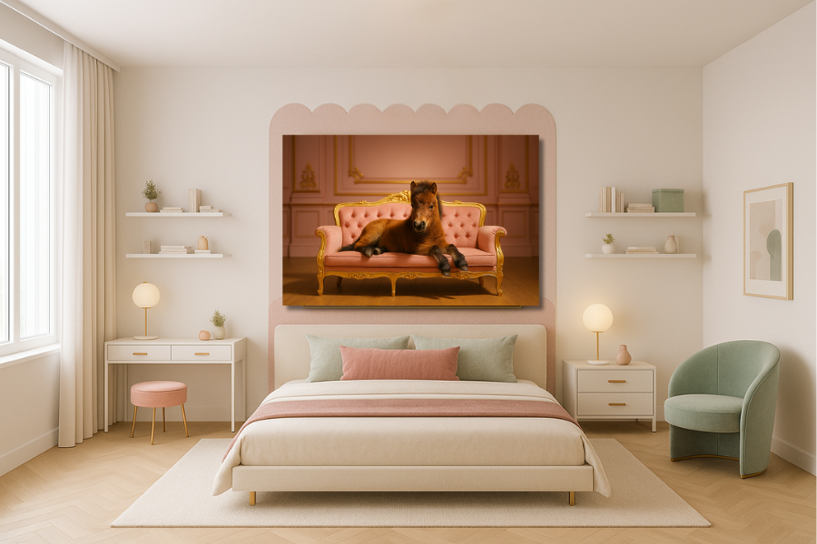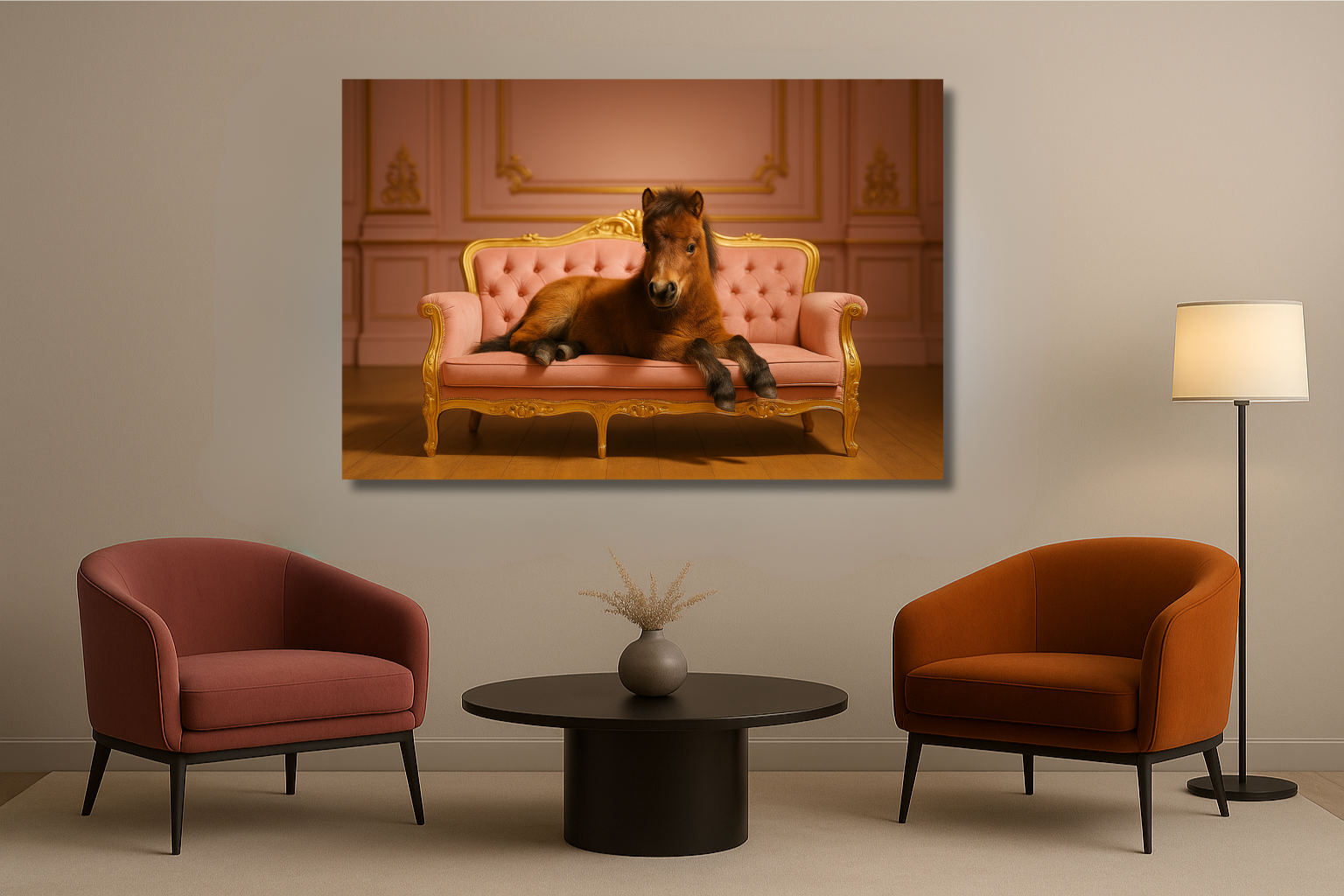 A Shetland pony rests on a rose-colored Rococo sofa. Playful luxury meets quiet naturalness. Protect – even the smallest horses deserve space and respect.