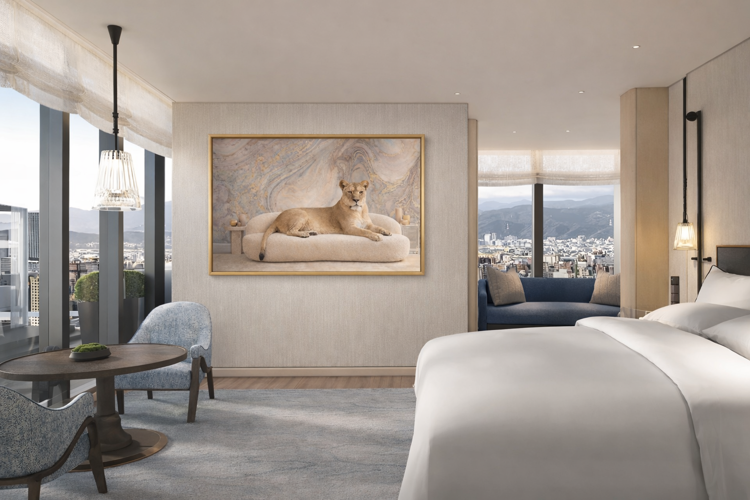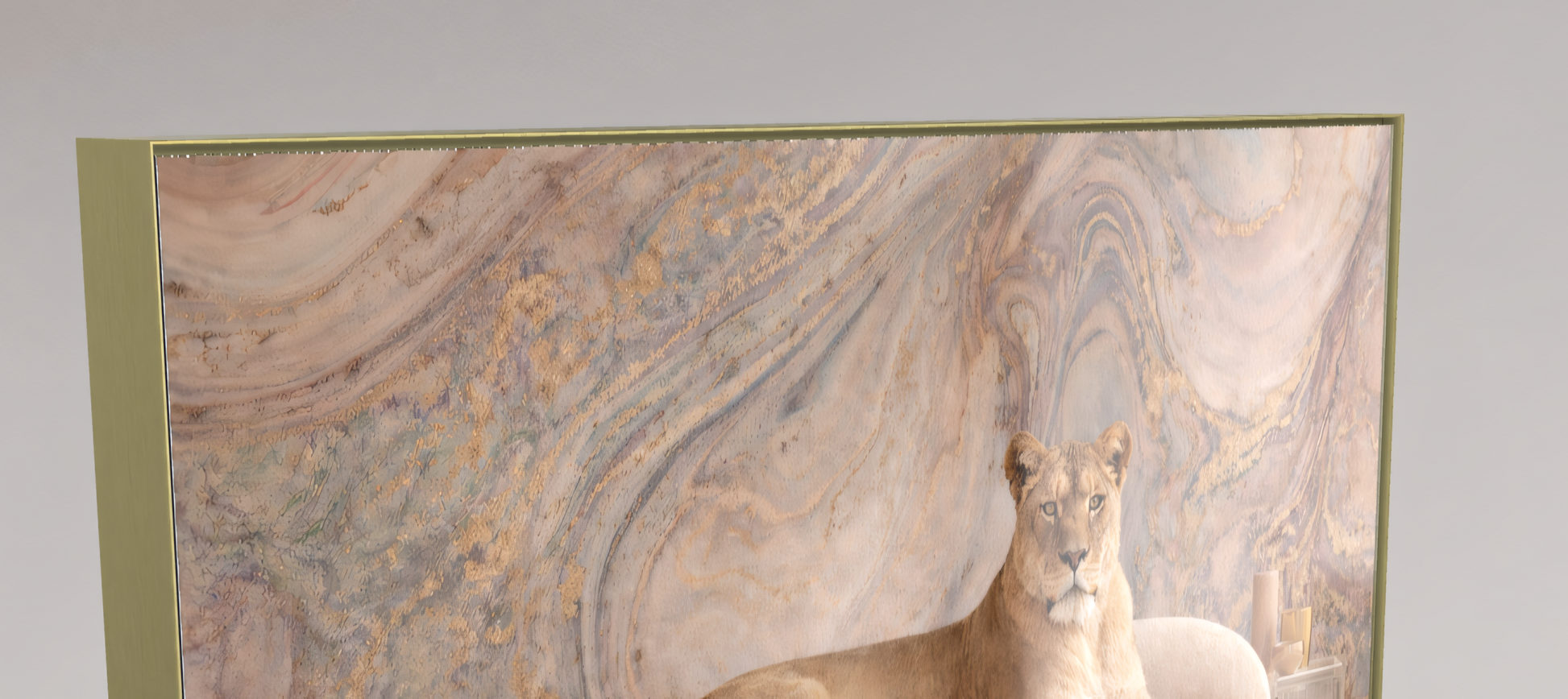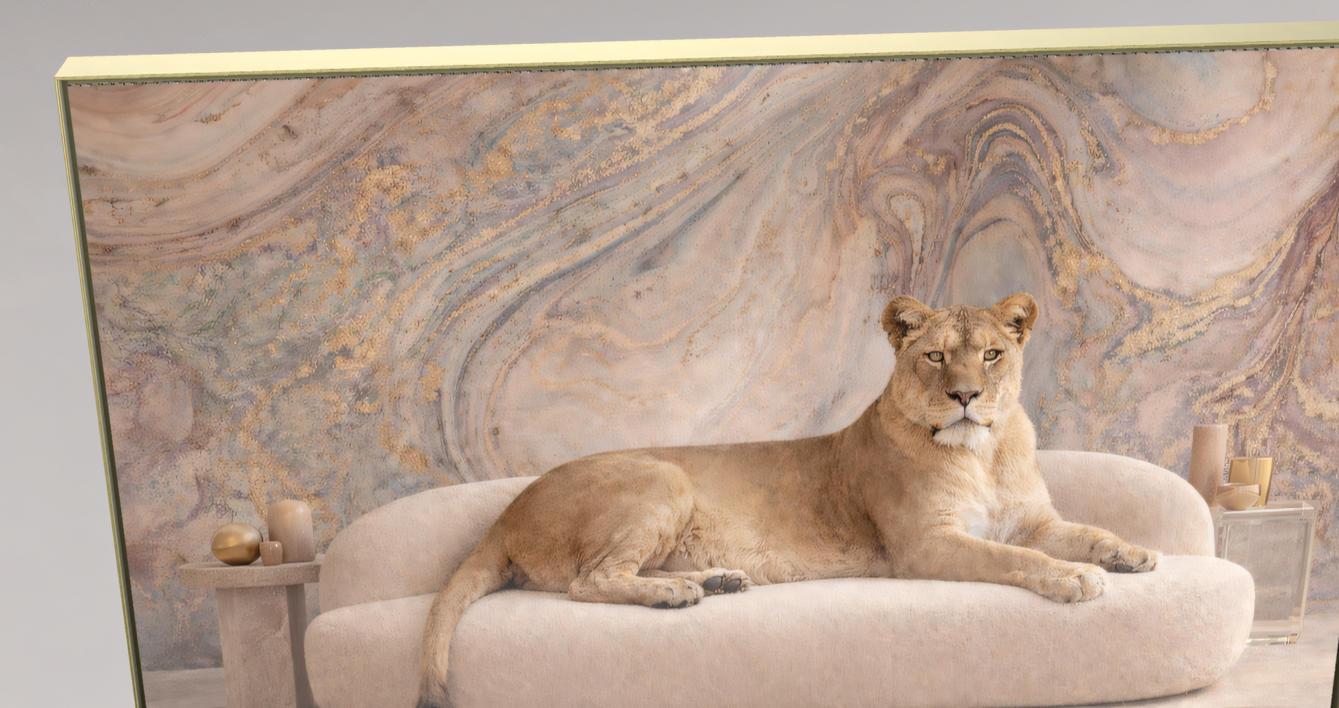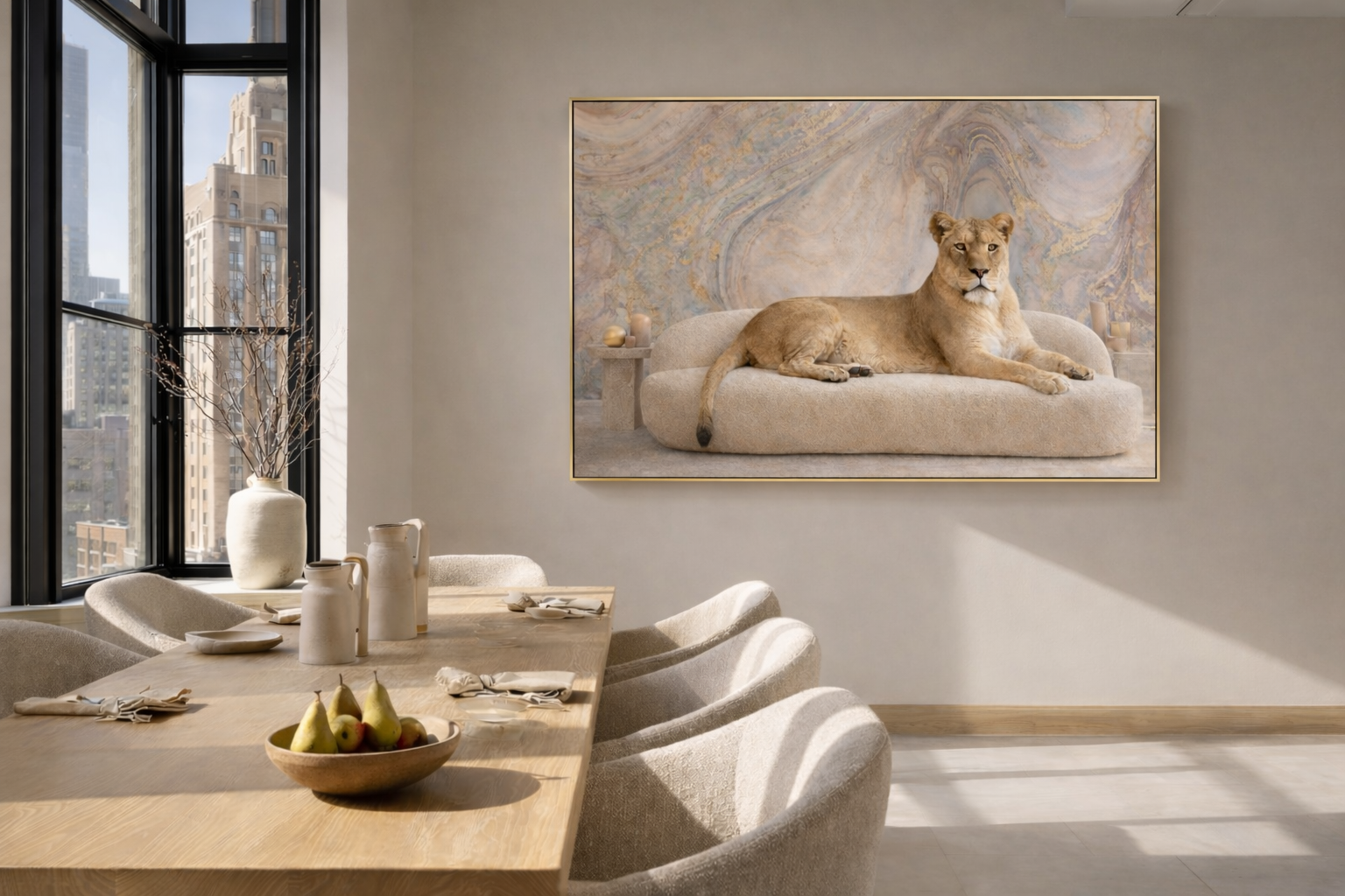 The lioness appears not as a hunting animal or a dramatic icon, but as a calm, self-assured presence in the space. Her power lies not in movement, but in control—in the way her body, gaze, and posture order the space without dominating it.
