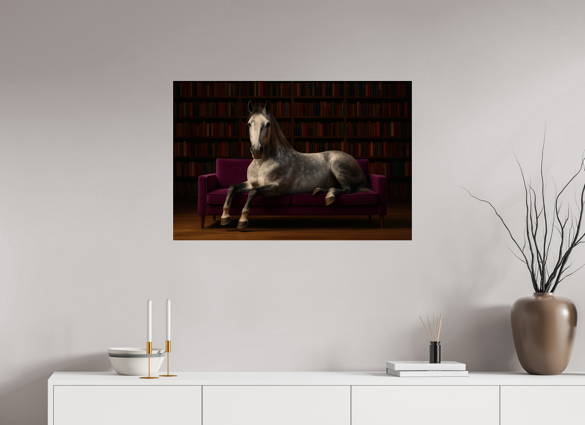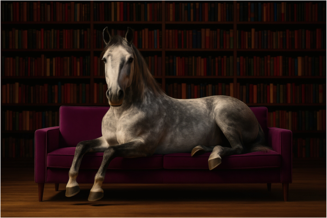 A dapple-grey horse lies on a purple sofa in a library. Between books and shadows, he seems like a living mystery of history.