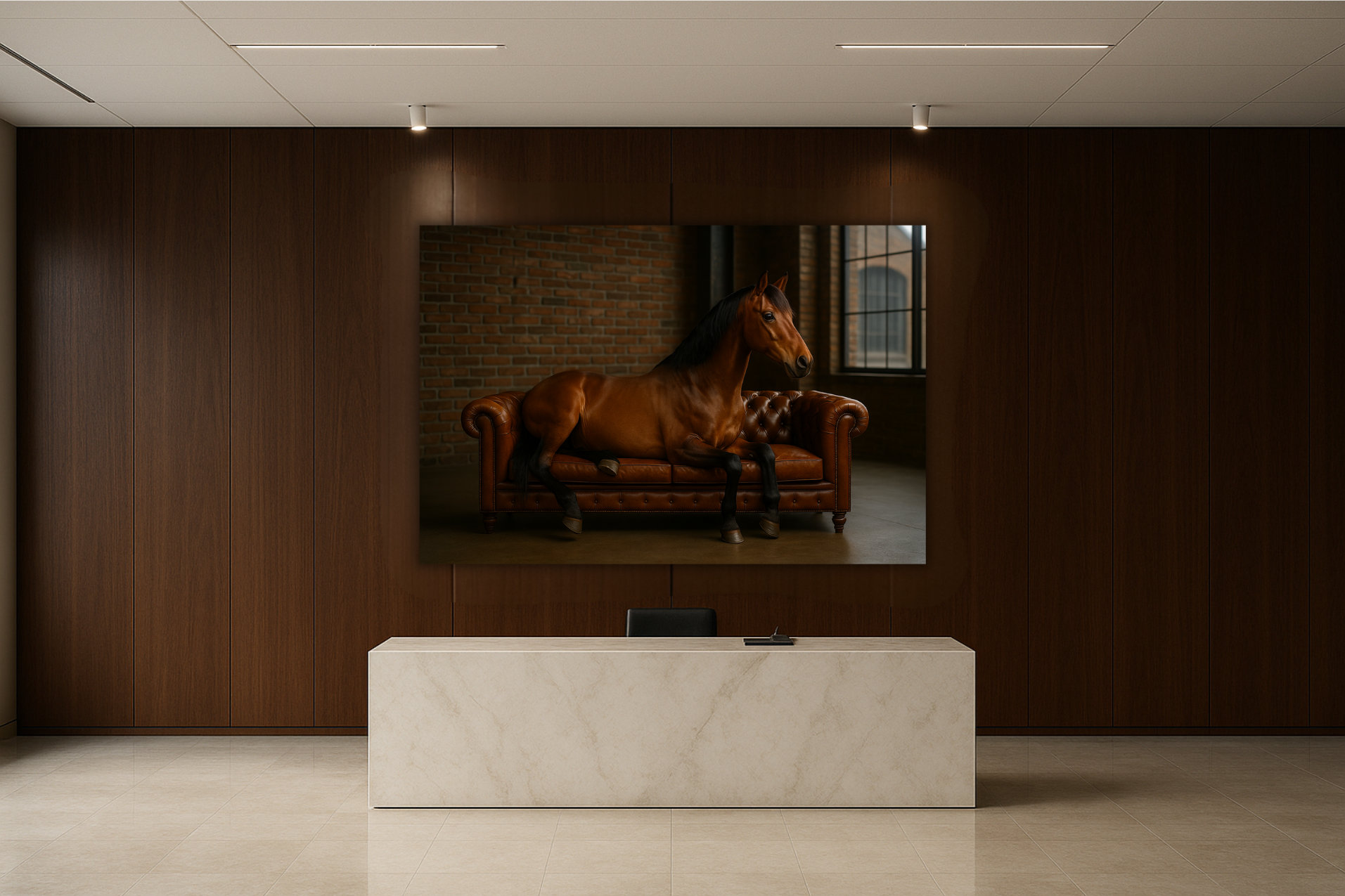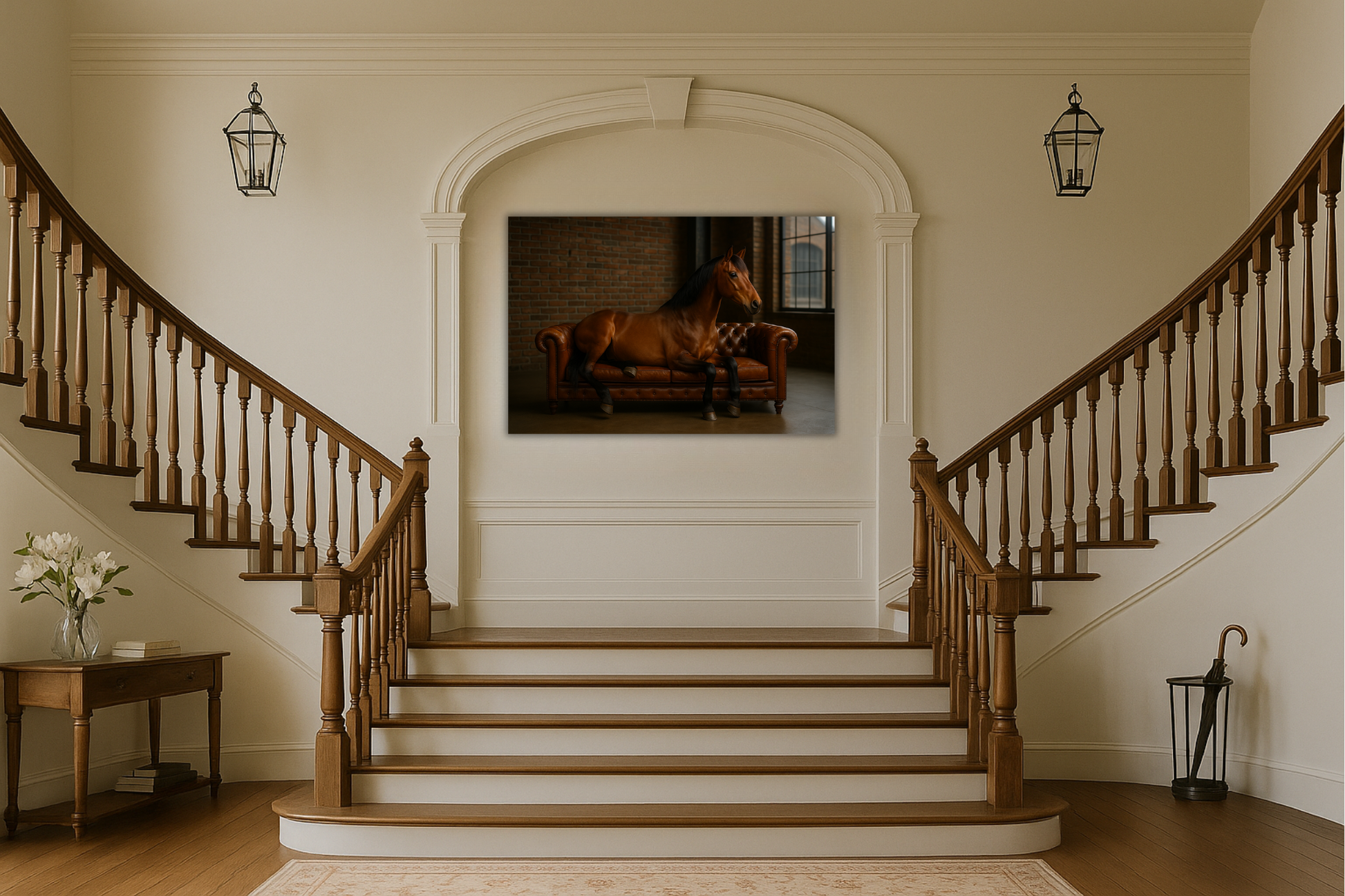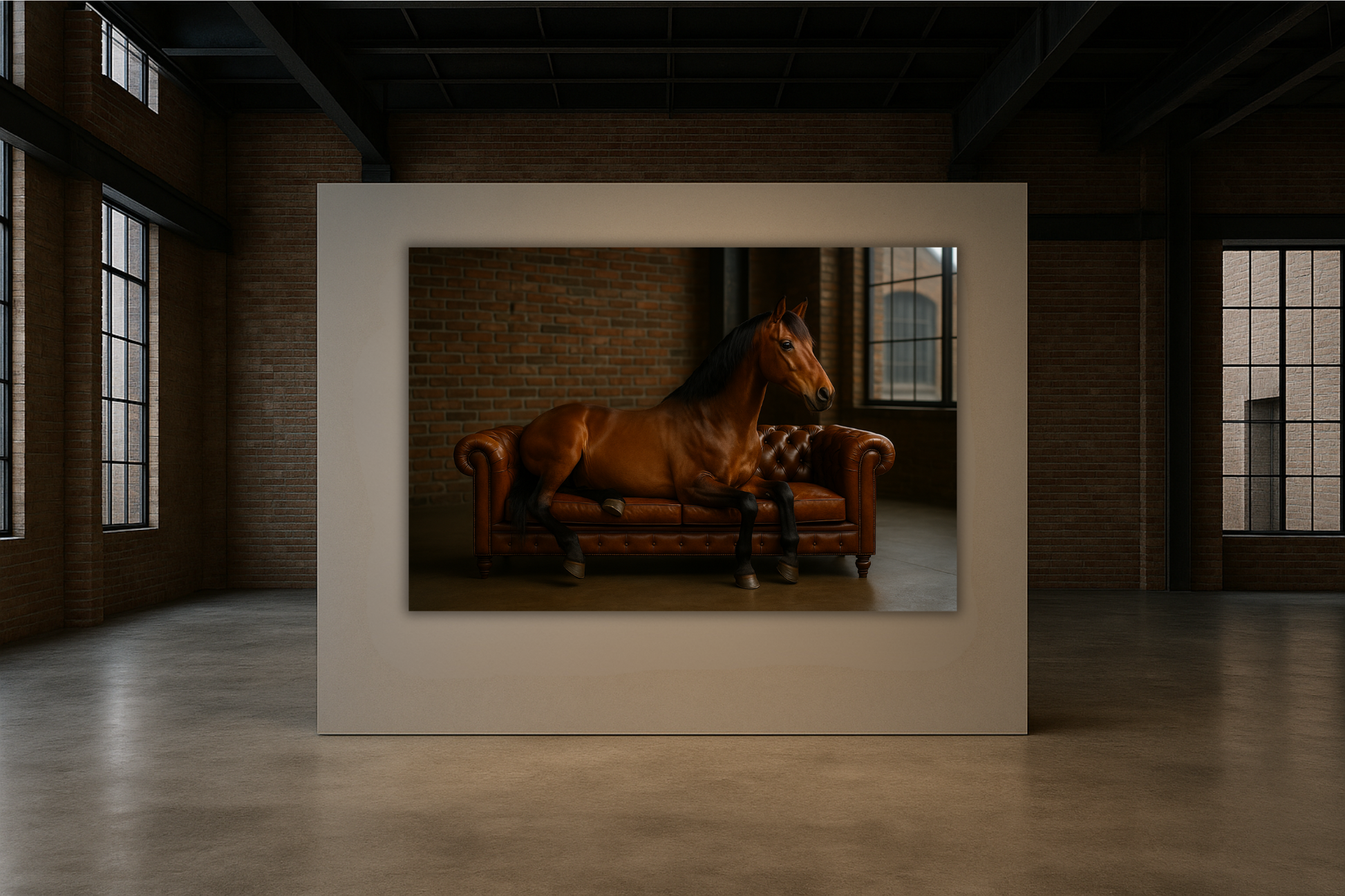 El Mustang en el loft: su imponente estructura sobre un sofá de cuero oscuro, rodeado de un moderno encanto industrial. Un encuentro entre lo salvaje y el diseño contemporáneo.
