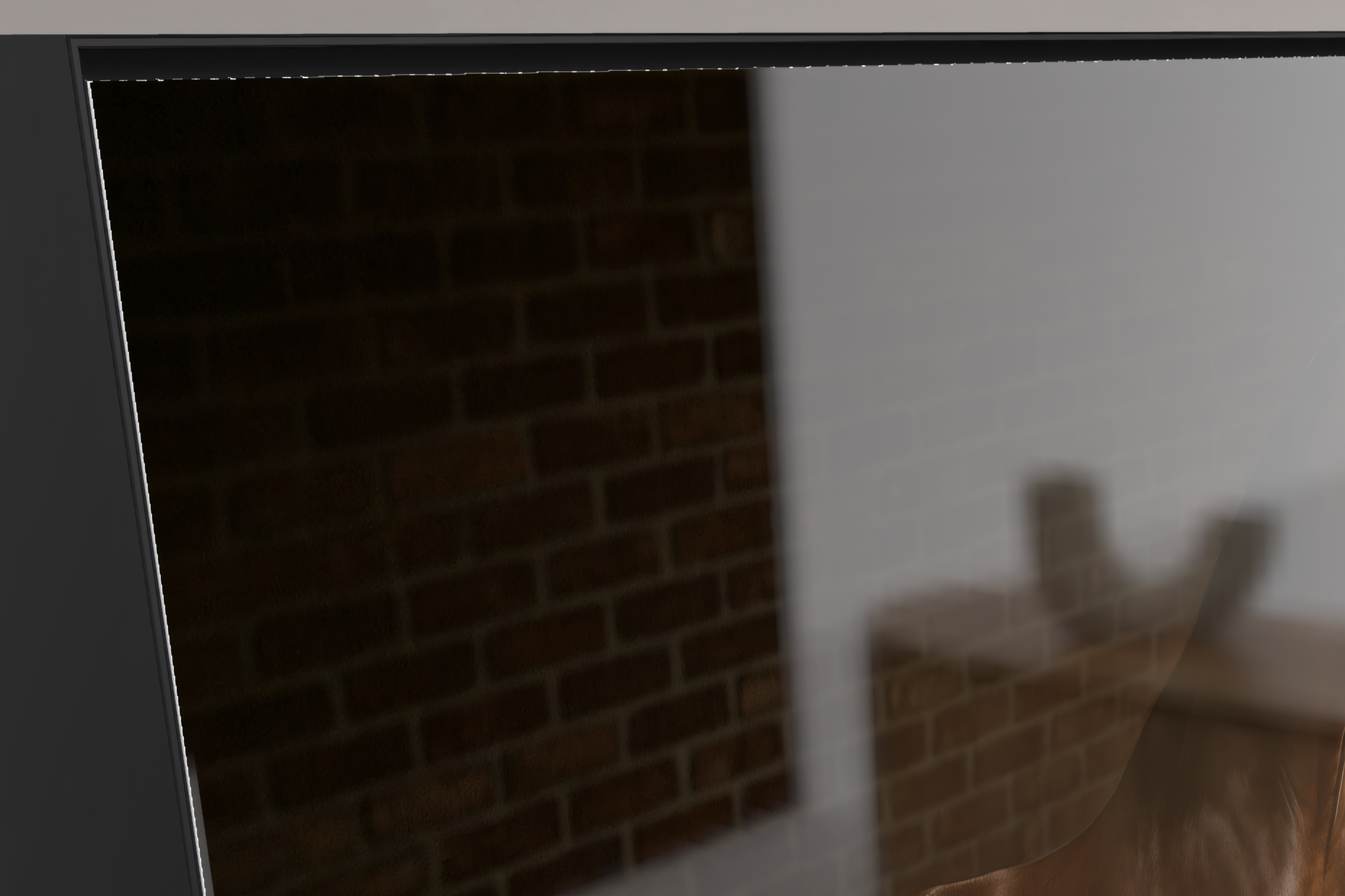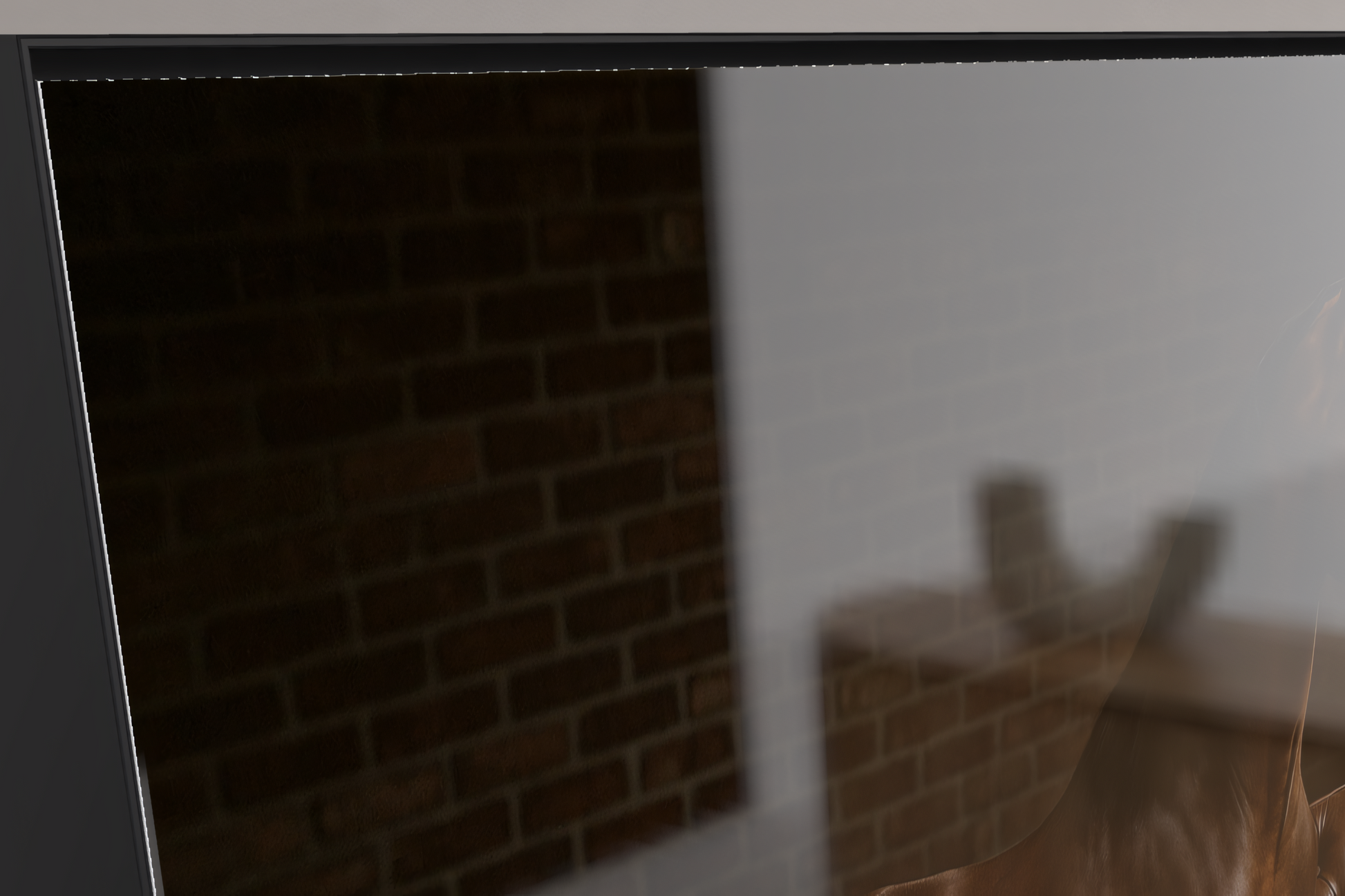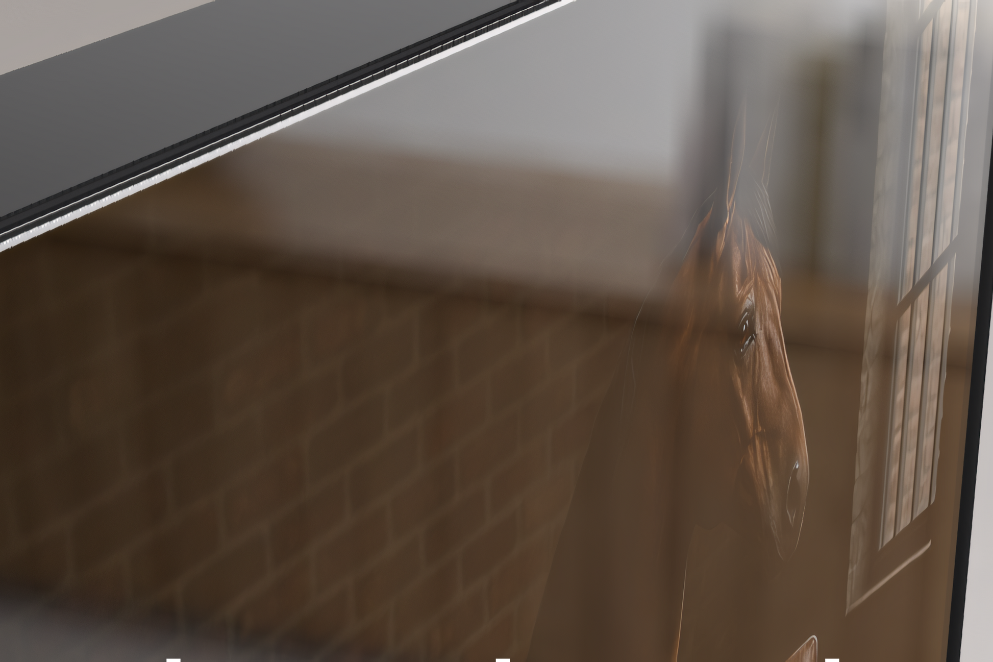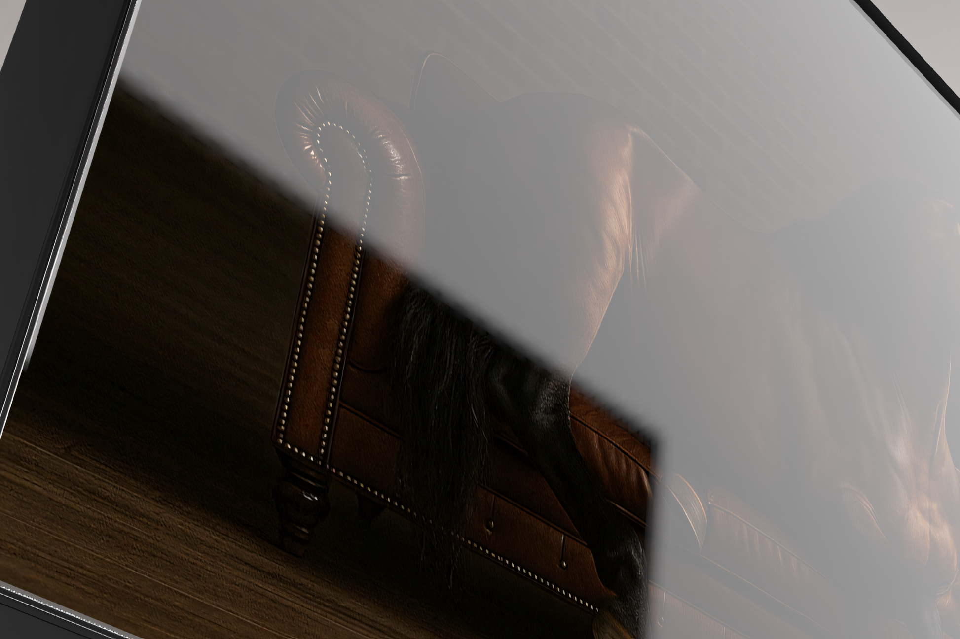 El Mustang en el loft: su imponente estructura sobre un sofá de cuero oscuro, rodeado de un moderno encanto industrial. Un encuentro entre lo salvaje y el diseño contemporáneo.
