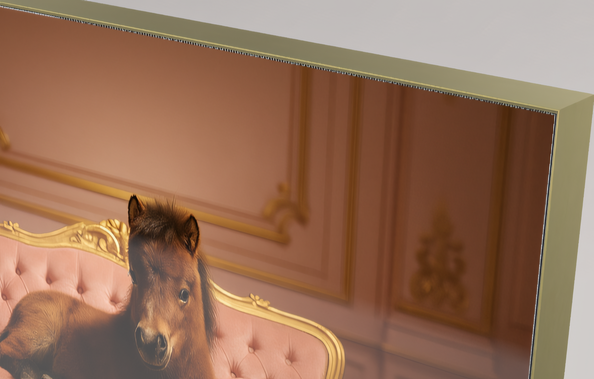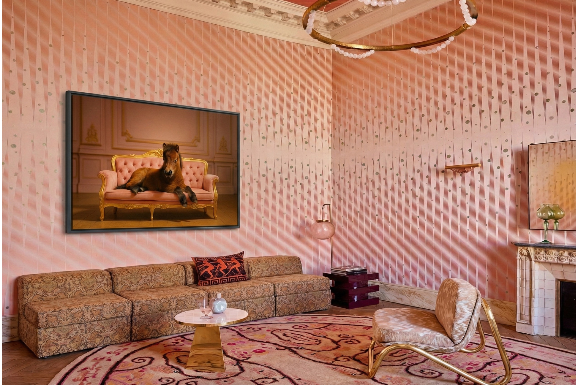 Ein Shetlandpony ruht auf einem roséfarbenen Rokoko-Sofa. Verspielter Luxus trifft auf stille Natürlichkeit. Protect – auch die kleinsten Pferde verdienen Raum und Respekt.
