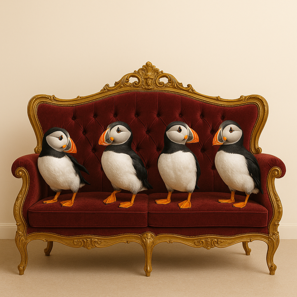 Vier Papageitaucher – vereint auf einem Thron der Eleganz.
