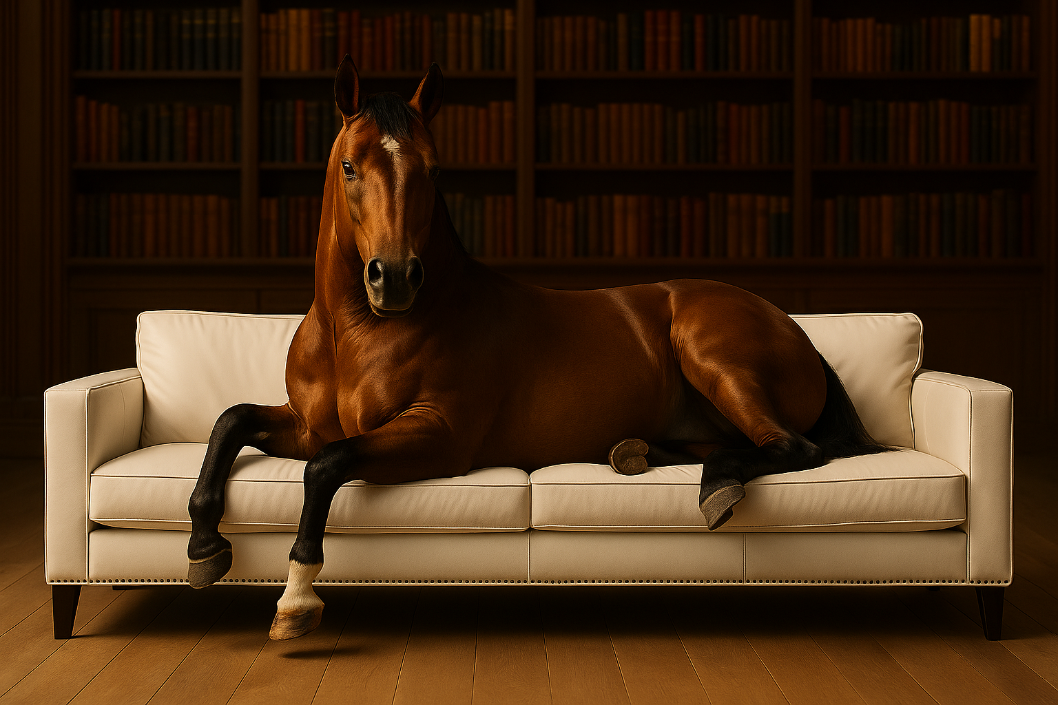 Ein iberisches Pferd ruht auf einem cremefarbenen Sofa im Glanz eines goldgetönten Raumes. Die Szene vereint Stille und Adel – eine Hommage an die innere Ruhe der Stärke. In der Leichtigkeit des Moments liegt jene Würde, die sich nicht zeigen muss, um zu wirken.