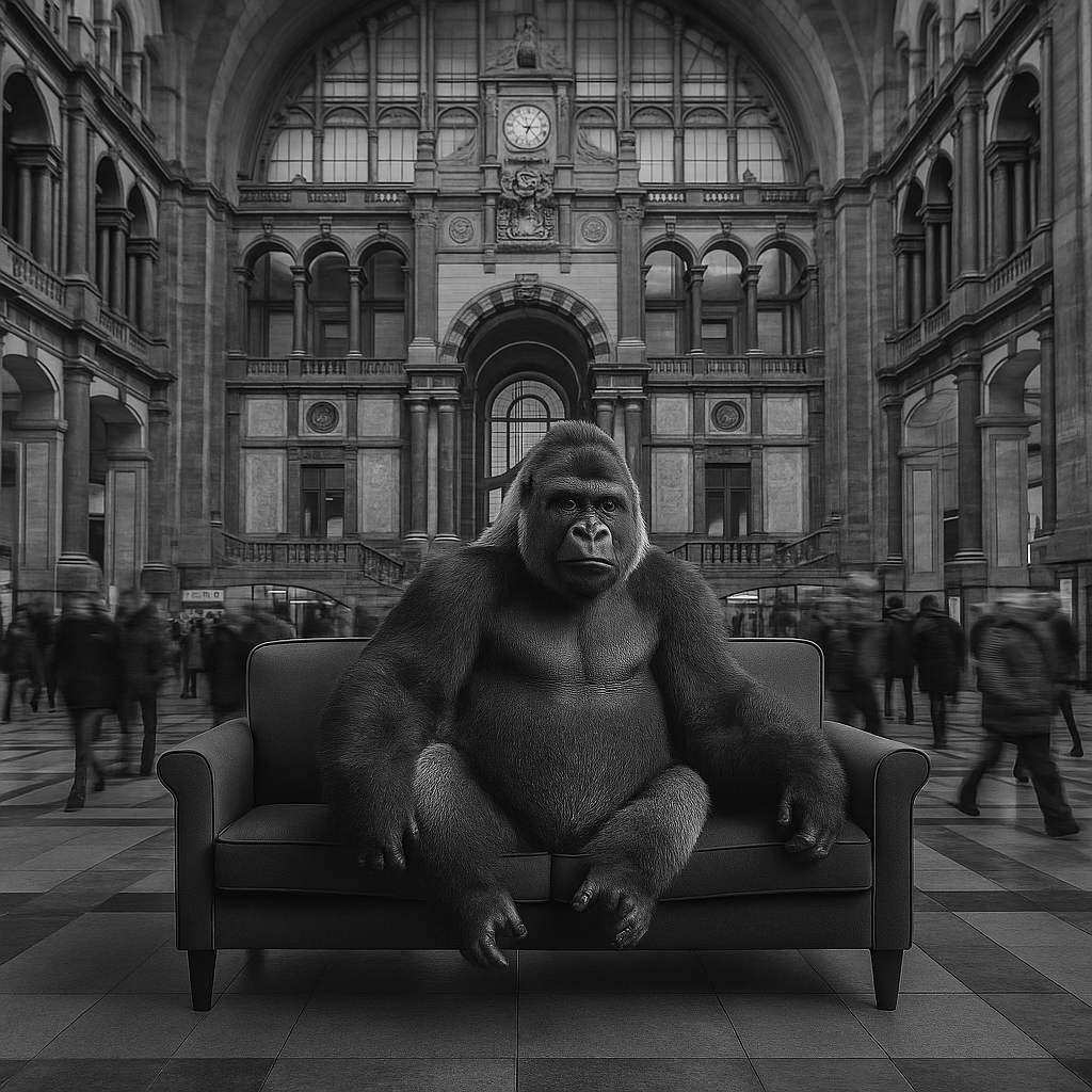 Zwischen rotem Samt und goldenem Rahmen entsteht ein leises Gleichgewicht aus Humor und Würde.