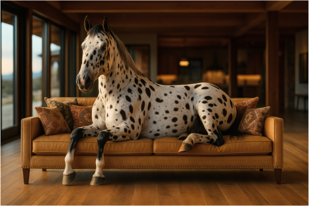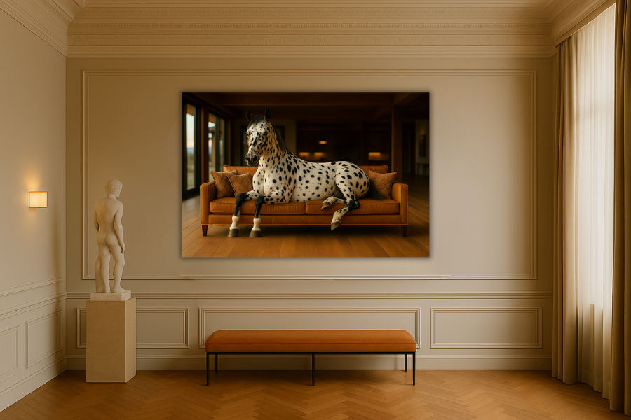 Ein Appaloosa ruht auf einem warmen Boho-Sofa, sein geflecktes Fell verstärkt die Wildheit inmitten rustikaler Eleganz.