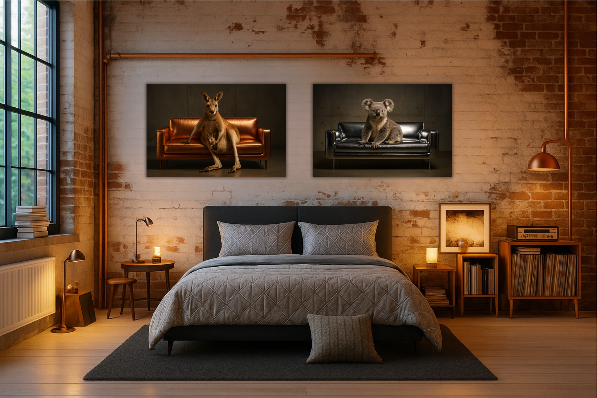 Dieses Werk ist Teil des Diptychons EinKontinent, zwei Schicksale und zeigt ausschließlich das Koala -Motiv. Die Darstellung des Kängurus dient nur zur Veranschaulichung des Gesamtkonzepts. Beim Kauf erhalten Sie ausschließlich das Koala-Werk.