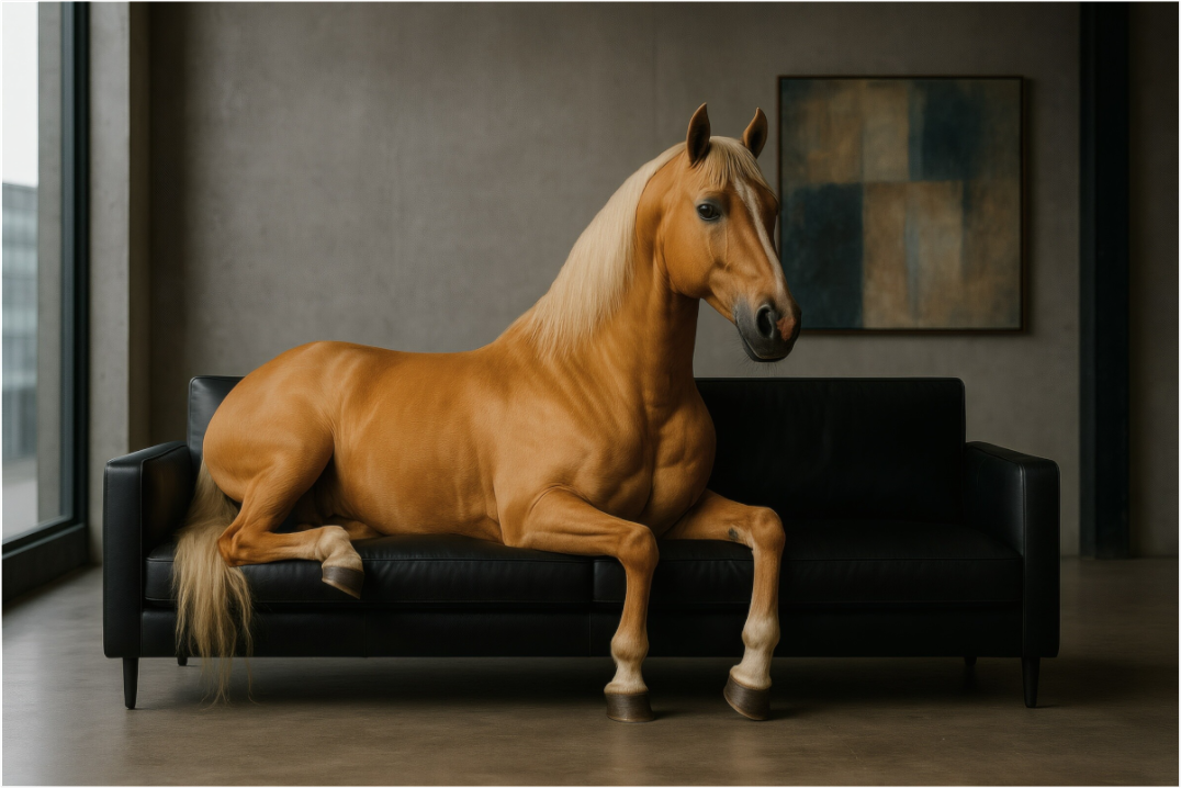 Der Palomino Mustang erstrahlt auf einem modernen schwarzen Sofa im urbanen Apartment von Los Angeles. Goldene Eleganz trifft auf zeitgenössischen Minimalismus.
