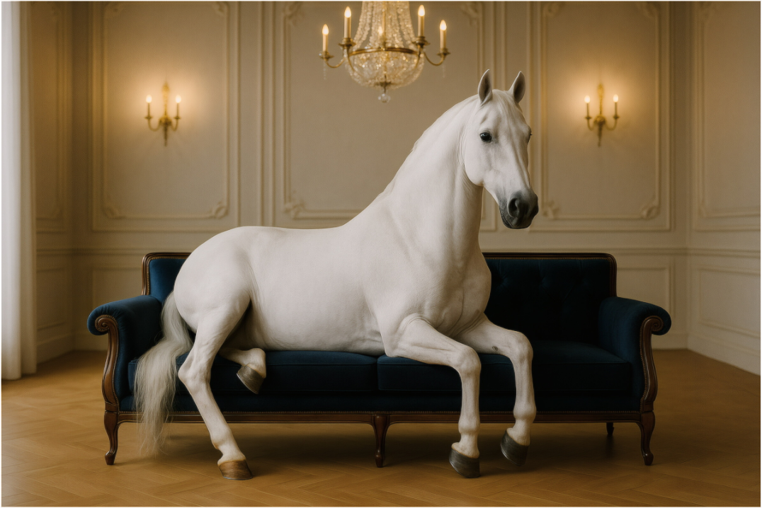 Ein strahlend weißer Lipizzaner auf tiefdunklem Sofa, eingerahmt von barocken Stuckwänden und Kristalllüstern. Ein Sinnbild königlicher Eleganz und klassischer Schönheit.
