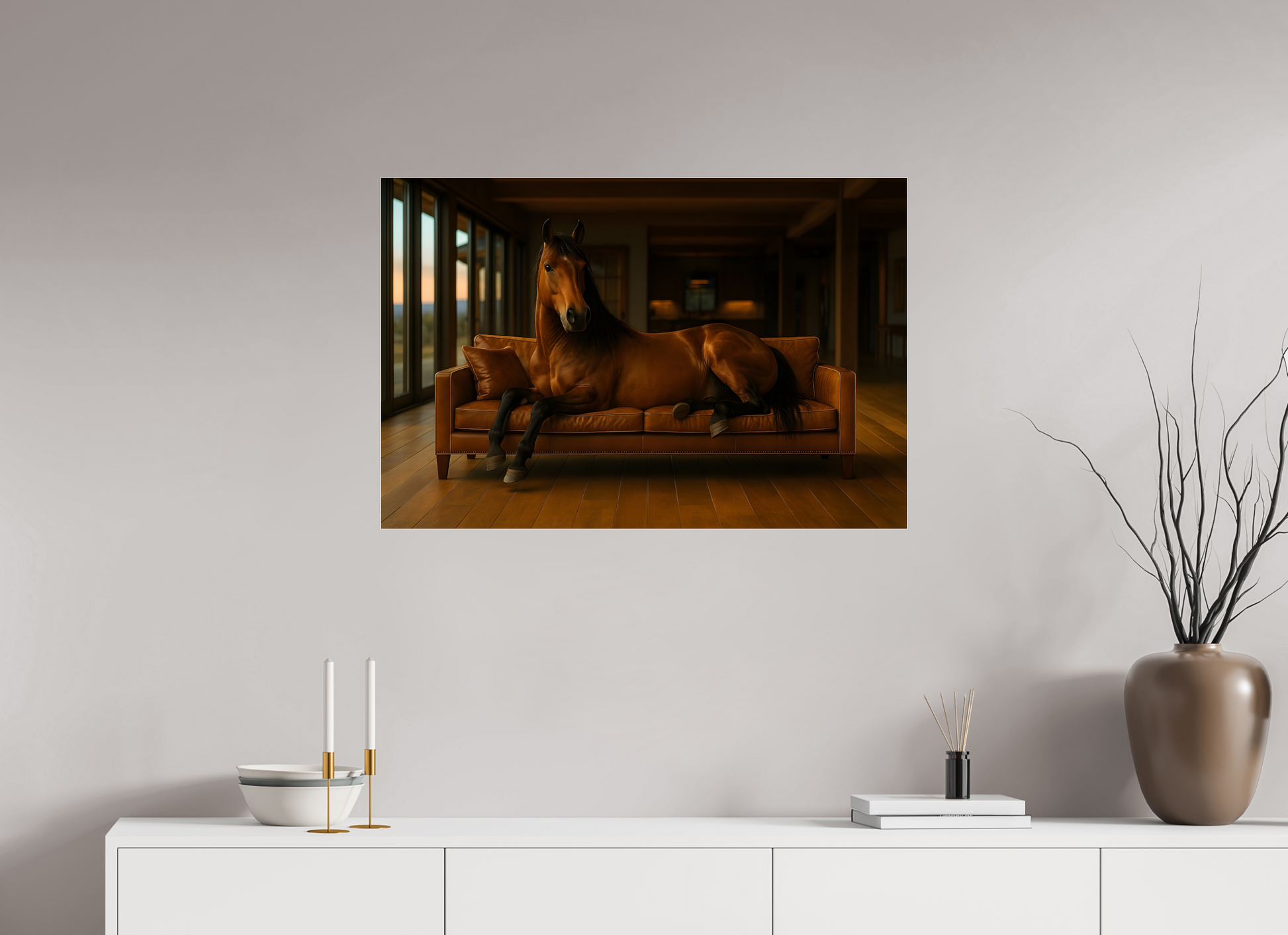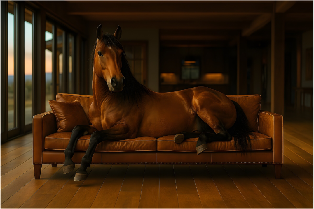 Mit Blick hinaus in die Weite liegt der Mustang auf einem Ranch-Sofa. Durch die großen Glasfronten öffnet sich die Landschaft, und das Pferd wirkt wie ein Tor zur Freiheit.