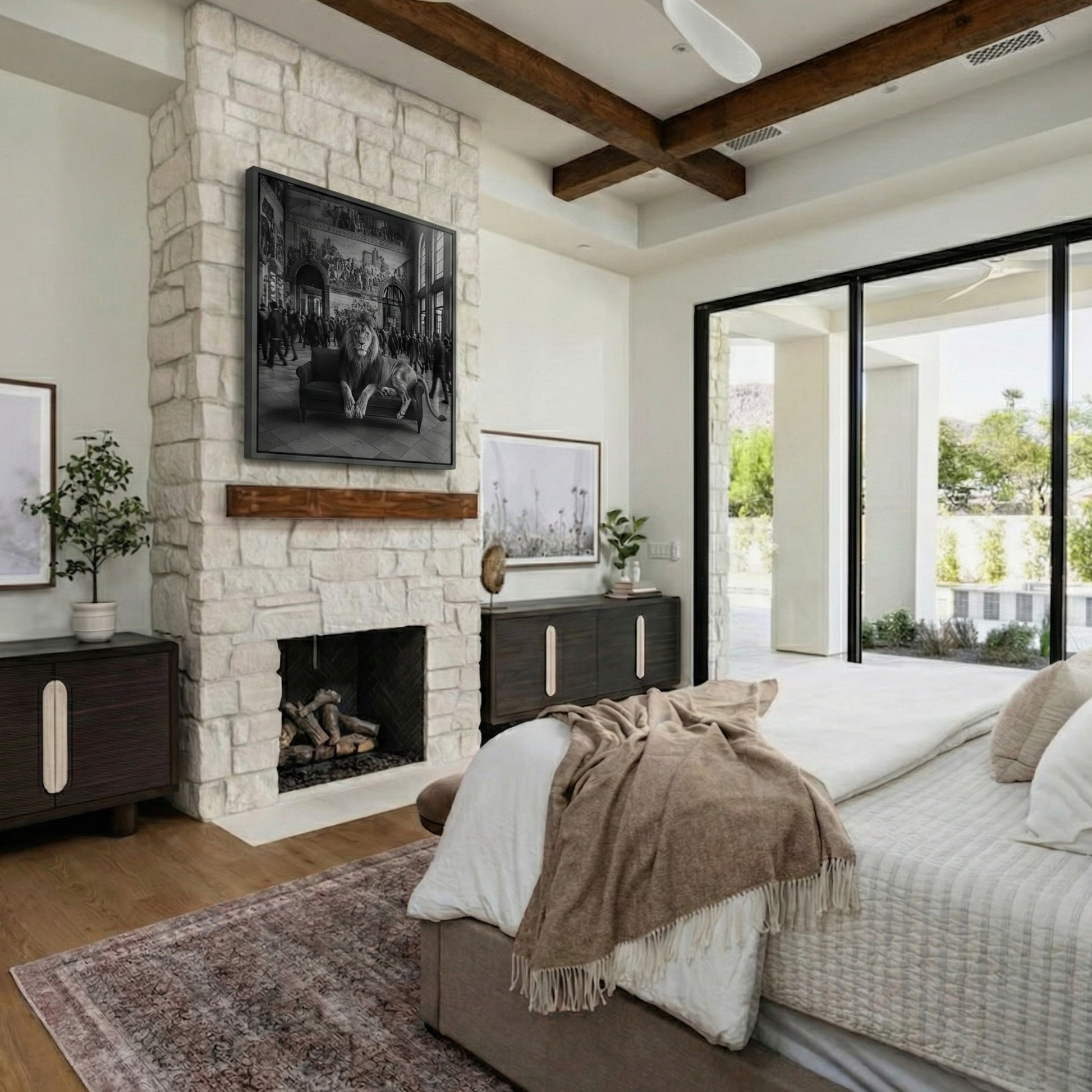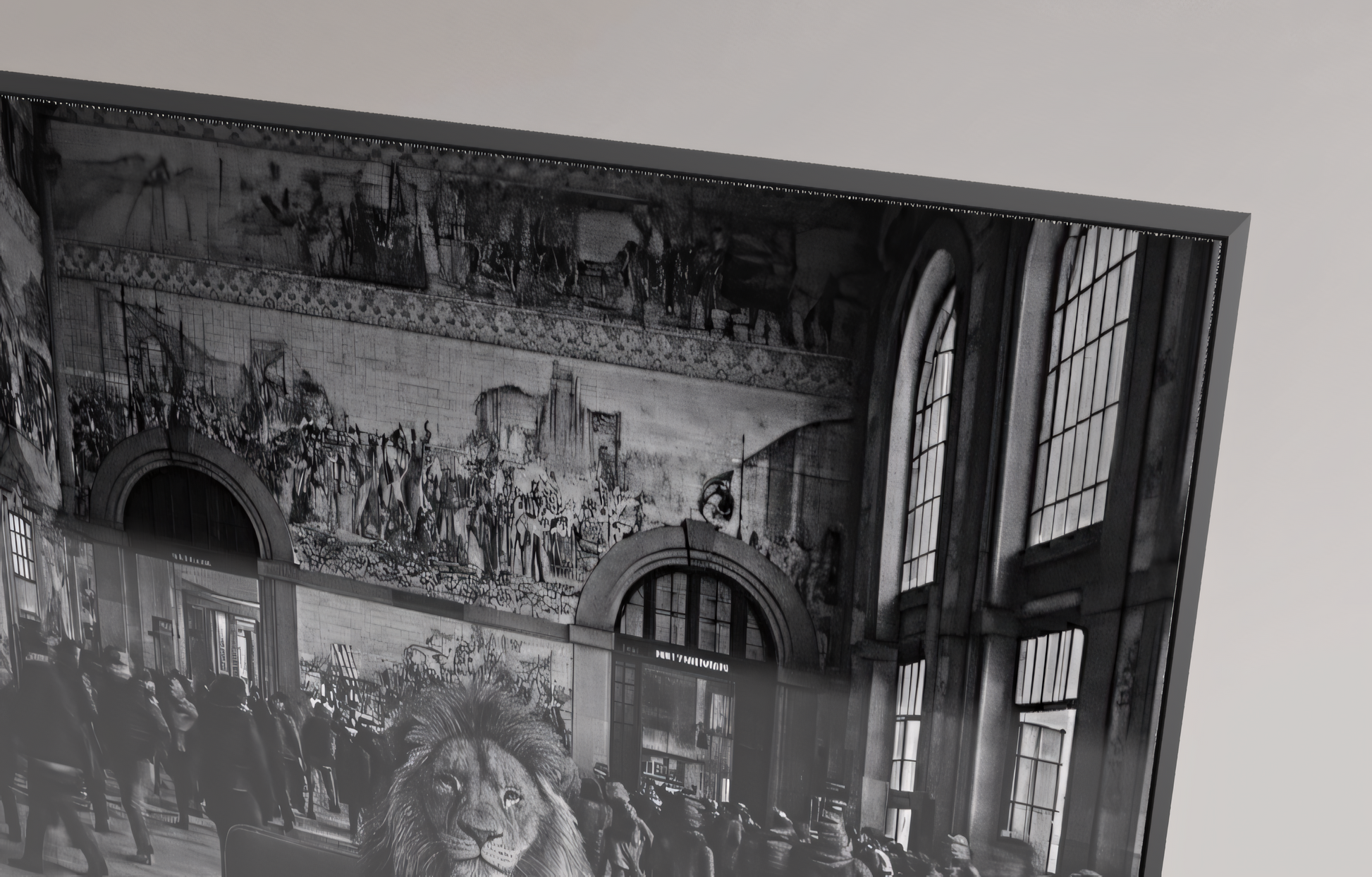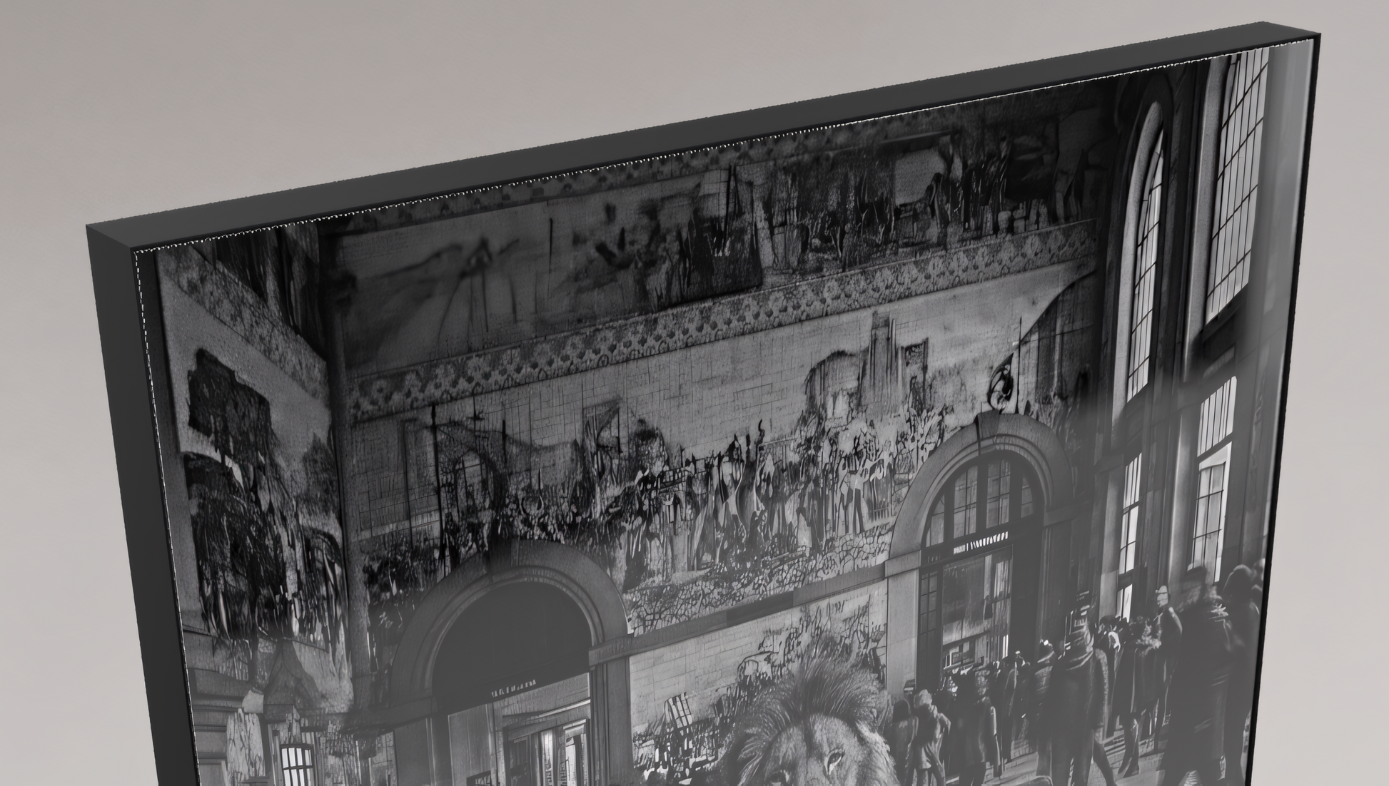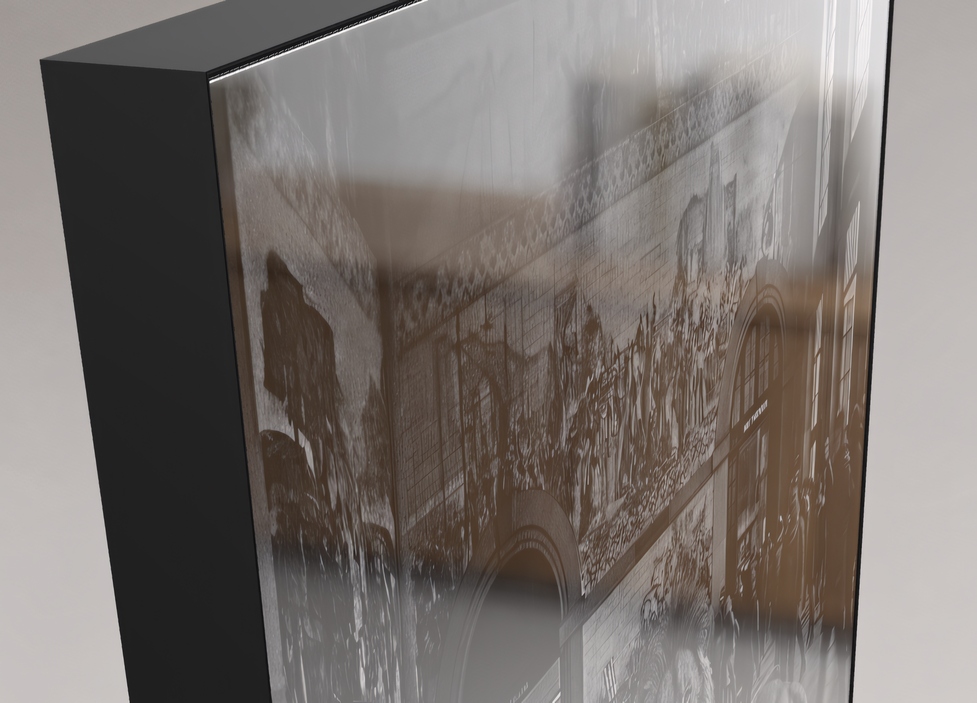 Um der inhaltlichen Bedeutung und räumlichen Wirkung gerecht zu werden, wurde für diese Edition eine außergewöhnliche Rahmentiefe gewählt - realisiert durch den Brandhoek ART BOX ALURAHMEN, 75 mm Schwarz, 2mm Acrylglas, Fuji Crystal Archive glänzend.